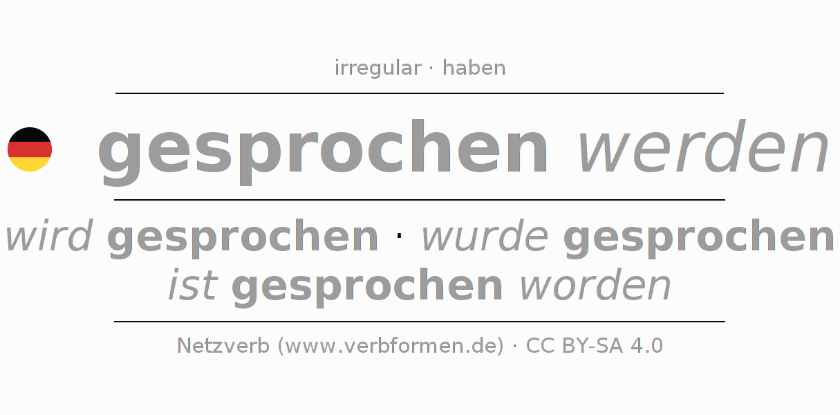 La conjugación de sprechen en Presente Indicativo Presente Pasivo procesivo es ich werde gesprochen, du wirst gesprochen, er wird gesprochen, wir werden gesprochen, ihr werdet gesprochen, sie werden gesprochen.Para construir esta formas se requiere seguir algunas reglas gramaticales y también las especificaciones para la conjugación de verbos simples de sprechen en Presente . Comentarios ☆