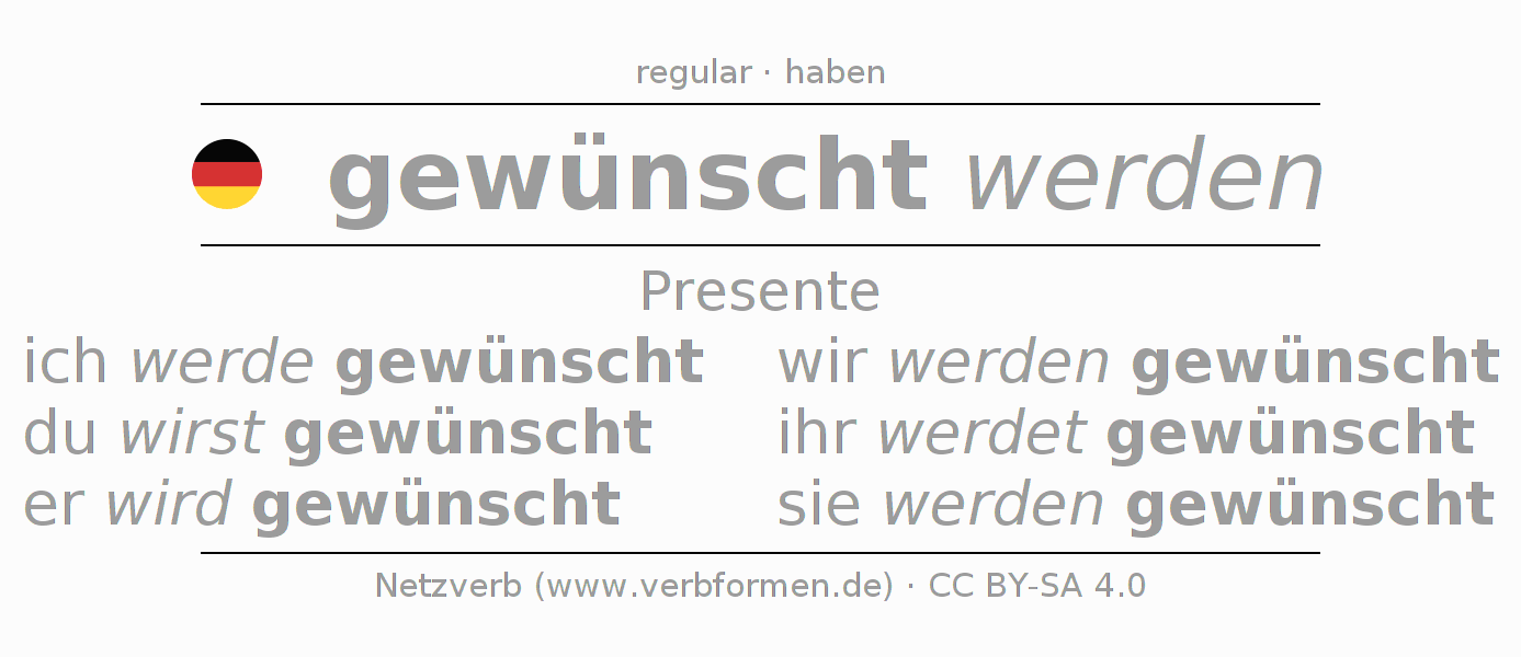 La conjugación de wünschen en Presente Indicativo Presente Pasivo procesivo es ich werde gewünscht, du wirst gewünscht, er wird gewünscht, wir werden gewünscht, ihr werdet gewünscht, sie werden gewünscht.Para construir esta formas se requiere seguir algunas reglas gramaticales y también las especificaciones para la conjugación de verbos simples de wünschen en Presente . Comentarios ☆