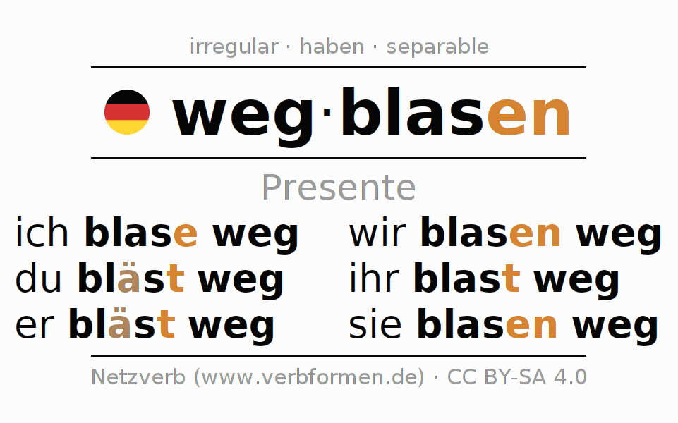 Este verbo wegblasen (soplar, despejar) se conjuga en presente de la siguiente manera: ich blase weg, du bläst weg, er bläst weg, wir blasen weg, ihr blast weg, sie blasen weg