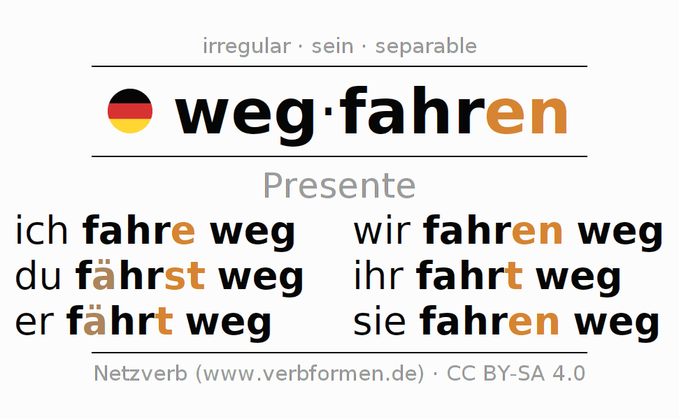 Este verbo wegfahren (irse, partir) se conjuga en presente de la siguiente manera: ich fahre weg, du fährst weg, er fährt weg, wir fahren weg, ihr fahrt weg, sie fahren weg