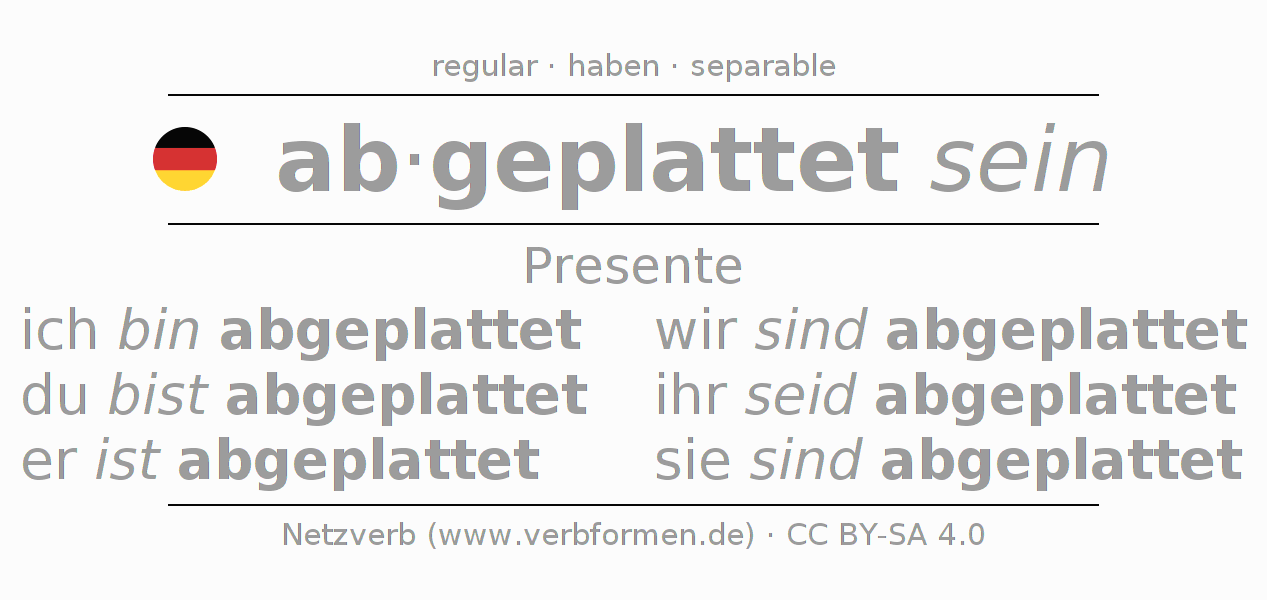 El verbo abplatten (hat), conjugado completamente en todas las personas y números gramaticales en Presente Indicativo.