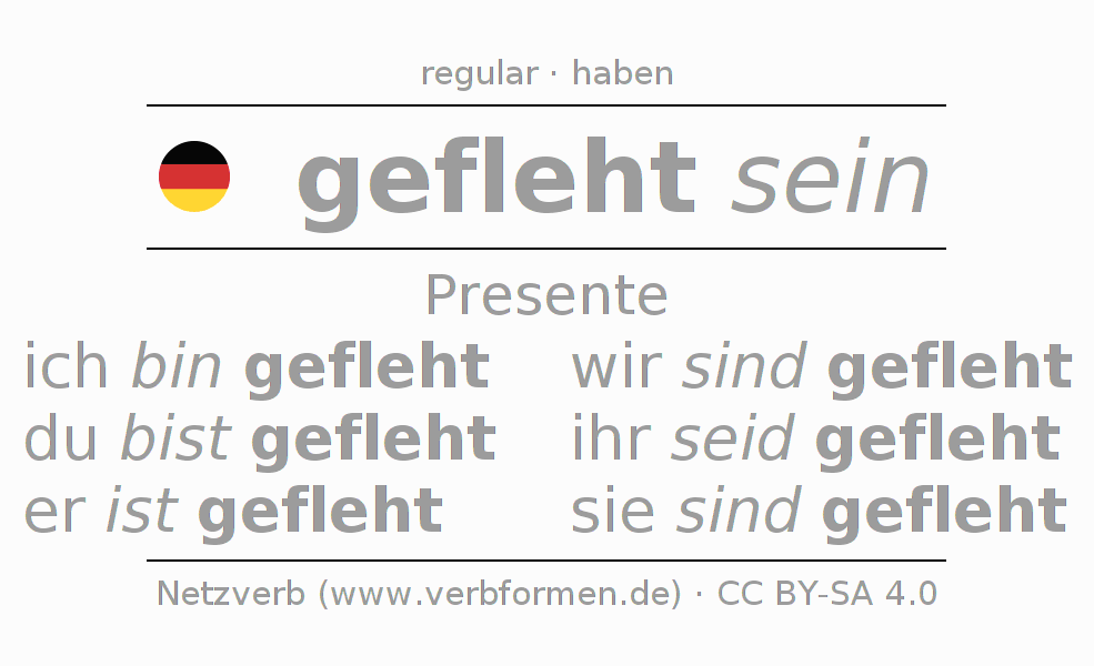 La conjugación de flehen en Presente Indicativo Presente Pasivo situativo es ich bin gefleht, du bist gefleht, er ist gefleht, wir sind gefleht, ihr seid gefleht, sie sind gefleht.Para construir esta formas se requiere seguir algunas reglas gramaticales y también las especificaciones para la conjugación de verbos simples de flehen en Presente . Comentarios ☆