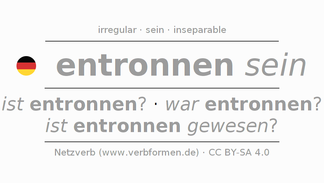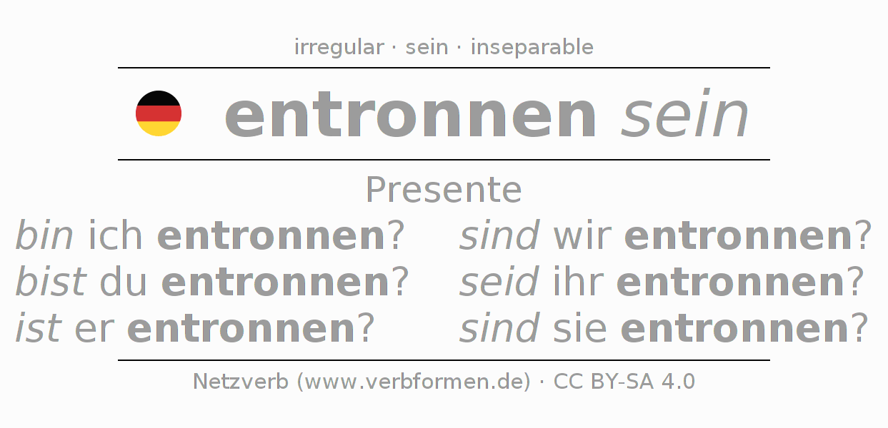 La conjugación de entrinnen en Presente Indicativo Presente Pasivo situativo es bin ich entronnen?, bist du entronnen?, ist er entronnen?, sind wir entronnen?, seid ihr entronnen?, sind sie entronnen?.Para construir esta formas se requiere seguir algunas reglas gramaticales y también las especificaciones para la conjugación de verbos simples de entrinnen en Presente . Comentarios ☆