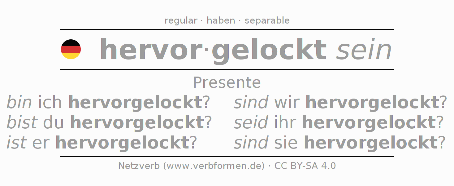 El verbo hervorlocken, conjugado completamente en todas las personas y números gramaticales en Presente Indicativo.