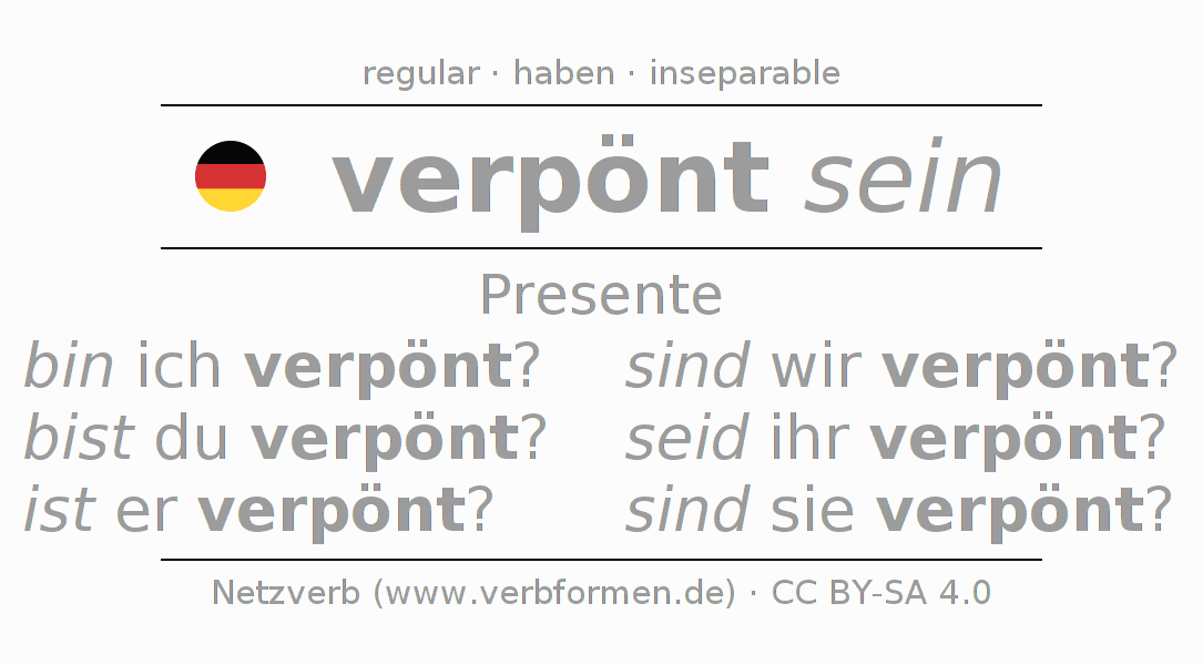 El verbo verpönen, conjugado completamente en todas las personas y números gramaticales en Presente Indicativo.