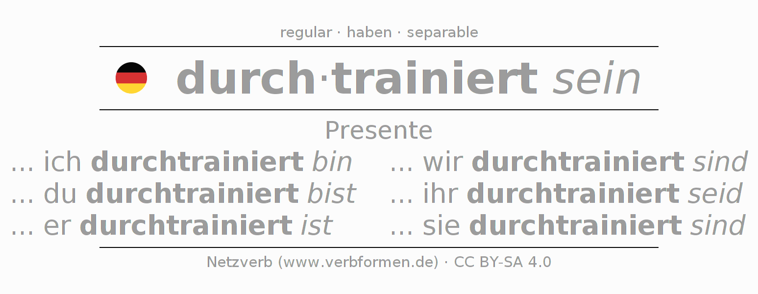 El verbo durchtrainieren, conjugado completamente en todas las personas y números gramaticales en Presente Indicativo.