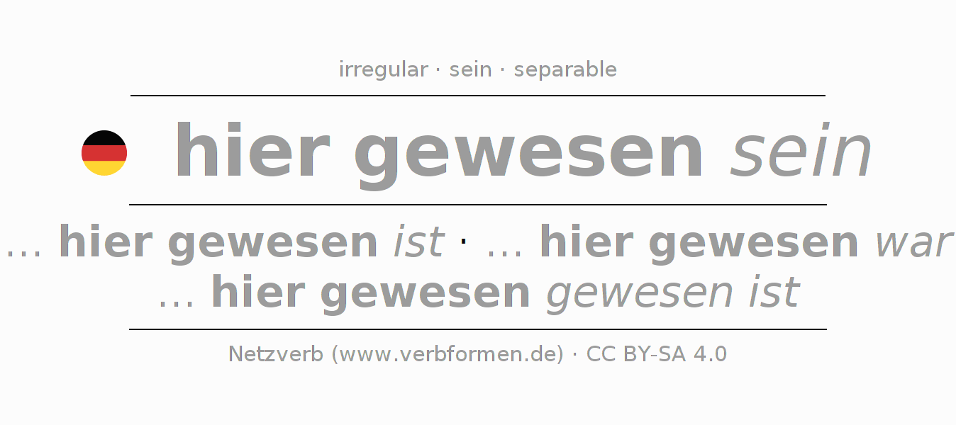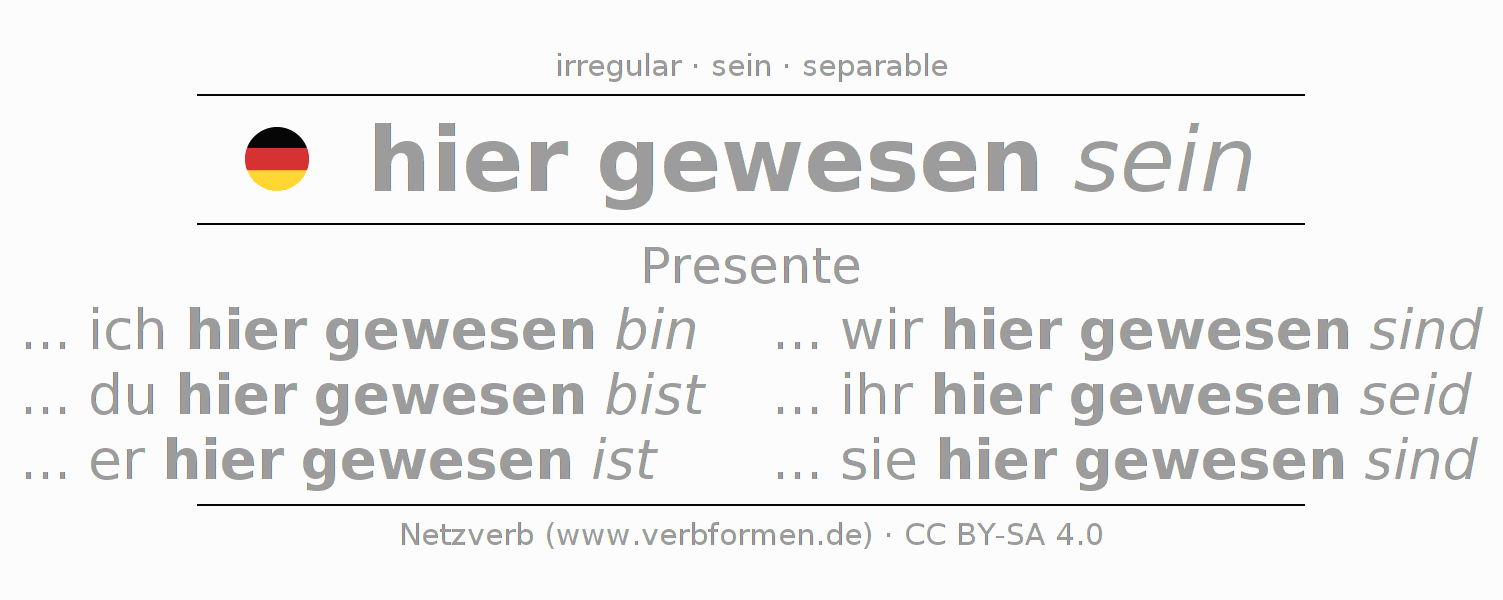 La conjugación de hiersein en Presente Indicativo Presente Pasivo situativo es ... ich hier gewesen bin, ... du hier gewesen bist, ... er hier gewesen ist, ... wir hier gewesen sind, ... ihr hier gewesen seid, ... sie hier gewesen sind.Para construir esta formas se requiere seguir algunas reglas gramaticales y también las especificaciones para la conjugación de verbos simples de hiersein en Presente . Comentarios ☆