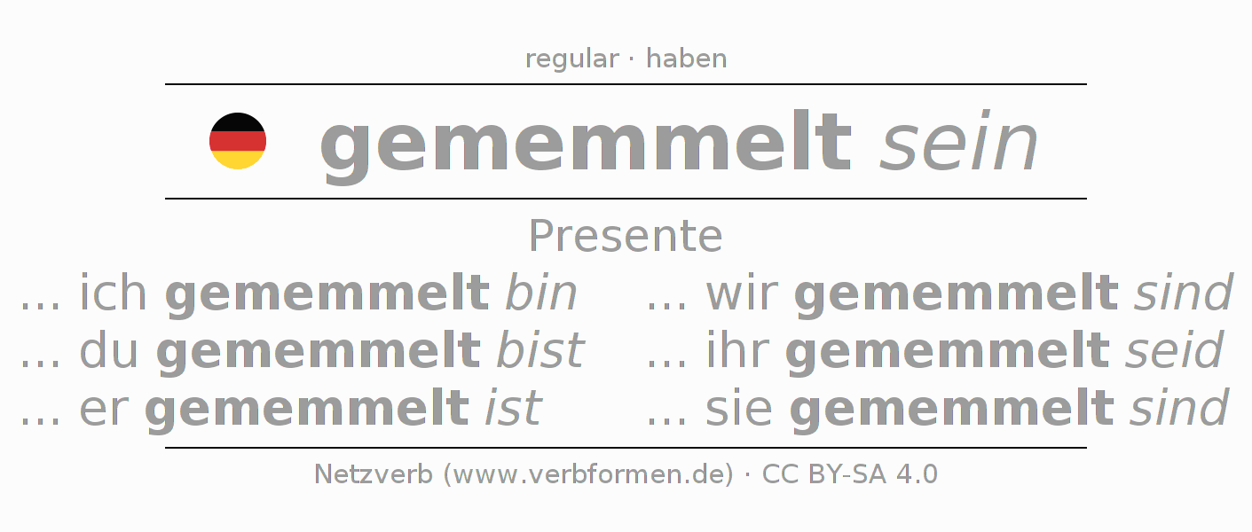 El verbo memmeln, conjugado completamente en todas las personas y números gramaticales en Presente Indicativo.