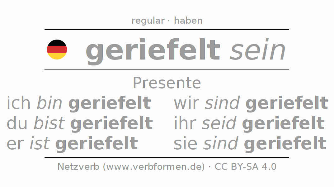 La conjugación de riefeln en Presente Indicativo Presente Pasivo situativo es ich bin geriefelt, du bist geriefelt, er ist geriefelt, wir sind geriefelt, ihr seid geriefelt, sie sind geriefelt.Para construir esta formas se requiere seguir algunas reglas gramaticales y también las especificaciones para la conjugación de verbos simples de riefeln en Presente . Comentarios ☆