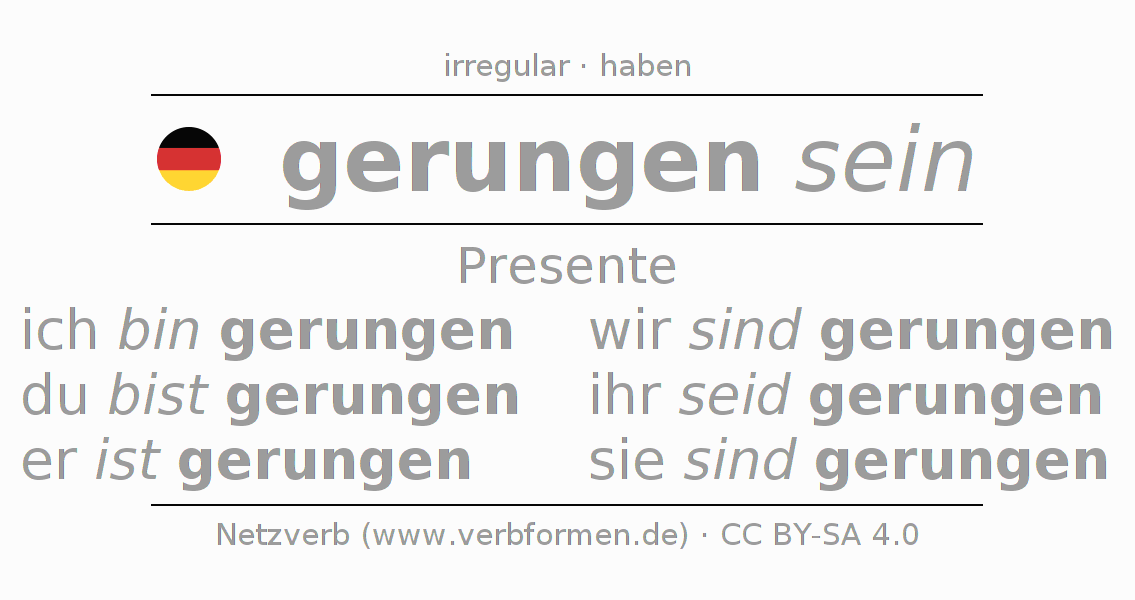 La conjugación de ringen en Presente Indicativo Presente Pasivo situativo es ich bin gerungen, du bist gerungen, er ist gerungen, wir sind gerungen, ihr seid gerungen, sie sind gerungen.Para construir esta formas se requiere seguir algunas reglas gramaticales y también las especificaciones para la conjugación de verbos simples de ringen en Presente . Comentarios ☆