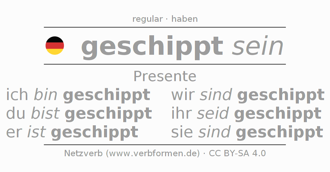 La conjugación de schippen en Presente Indicativo Presente Pasivo situativo es ich bin geschippt, du bist geschippt, er ist geschippt, wir sind geschippt, ihr seid geschippt, sie sind geschippt.Para construir esta formas se requiere seguir algunas reglas gramaticales y también las especificaciones para la conjugación de verbos simples de schippen en Presente . Comentarios ☆