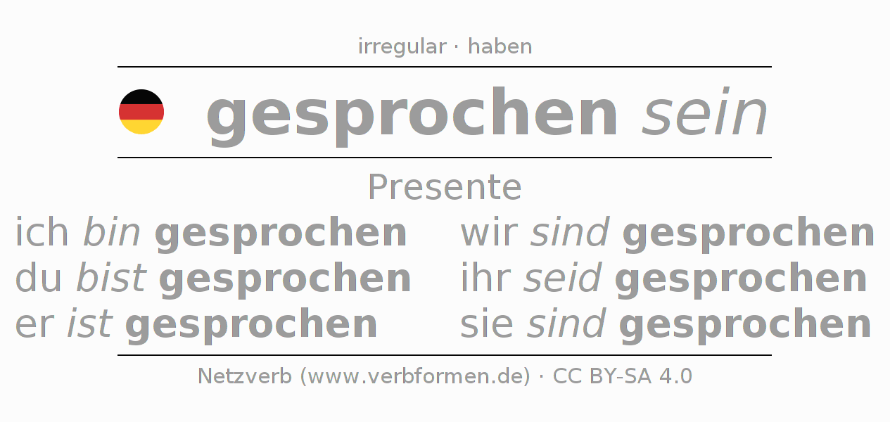 La conjugación de sprechen en Presente Indicativo Presente Pasivo situativo es ich bin gesprochen, du bist gesprochen, er ist gesprochen, wir sind gesprochen, ihr seid gesprochen, sie sind gesprochen.Para construir esta formas se requiere seguir algunas reglas gramaticales y también las especificaciones para la conjugación de verbos simples de sprechen en Presente . Comentarios ☆