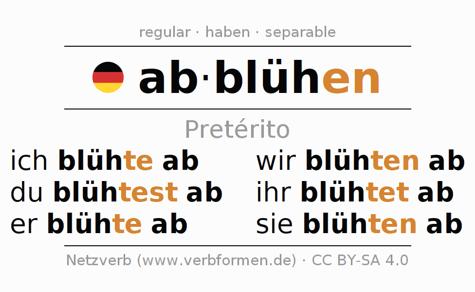 El verbo abblühen, conjugado completamente en todas las personas y números gramaticales en Pretérito Indicativo.