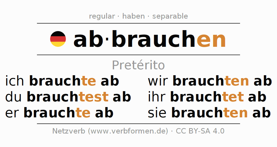Este verbo abbrauchen (consumir, desgastar) se conjuga en pretérito de la siguiente manera: ich brauchte ab, du brauchtest ab, er brauchte ab, wir brauchten ab, ihr brauchtet ab, sie brauchten ab