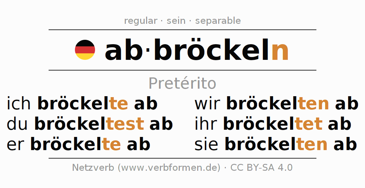 Este verbo abbröckeln (desprenderse, desmoronarse) se conjuga en pretérito de la siguiente manera: ich bröckelte ab, du bröckeltest ab, er bröckelte ab, wir bröckelten ab, ihr bröckeltet ab, sie bröckelten ab