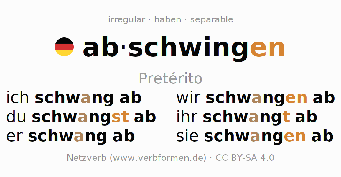 Este verbo abschwingen (desprenderse, saltar) se conjuga en pretérito de la siguiente manera: ich schwang ab, du schwangst ab, er schwang ab, wir schwangen ab, ihr schwangt ab, sie schwangen ab