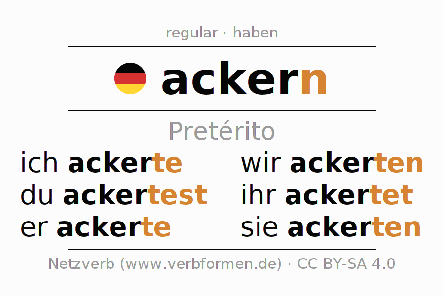 Este verbo ackern (arar, labrar) se conjuga en pretérito de la siguiente manera: ich ackerte, du ackertest, er ackerte, wir ackerten, ihr ackertet, sie ackerten