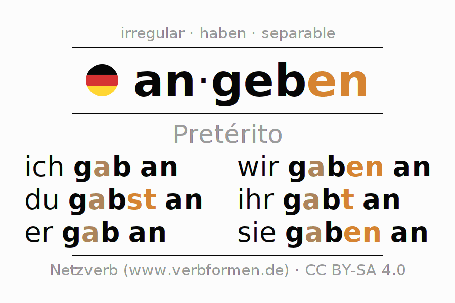 Este verbo angeben (fanfarronear, indicar) se conjuga en pretérito de la siguiente manera: ich gab an, du gabst an, er gab an, wir gaben an, ihr gabt an, sie gaben an