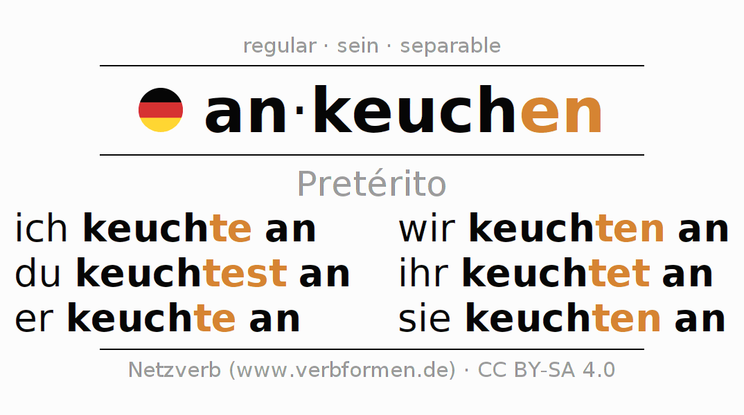 Este verbo ankeuchen (llegar jadeando) se conjuga en pretérito de la siguiente manera: ich keuchte an, du keuchtest an, er keuchte an, wir keuchten an, ihr keuchtet an, sie keuchten an