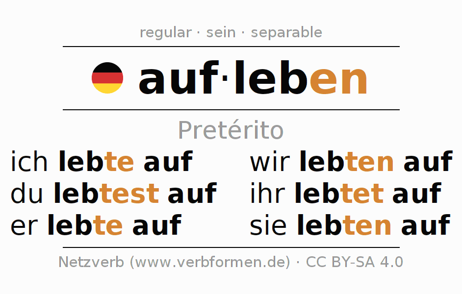Este verbo aufleben (resurgir, animarse) se conjuga en pretérito de la siguiente manera: ich lebte auf, du lebtest auf, er lebte auf, wir lebten auf, ihr lebtet auf, sie lebten auf