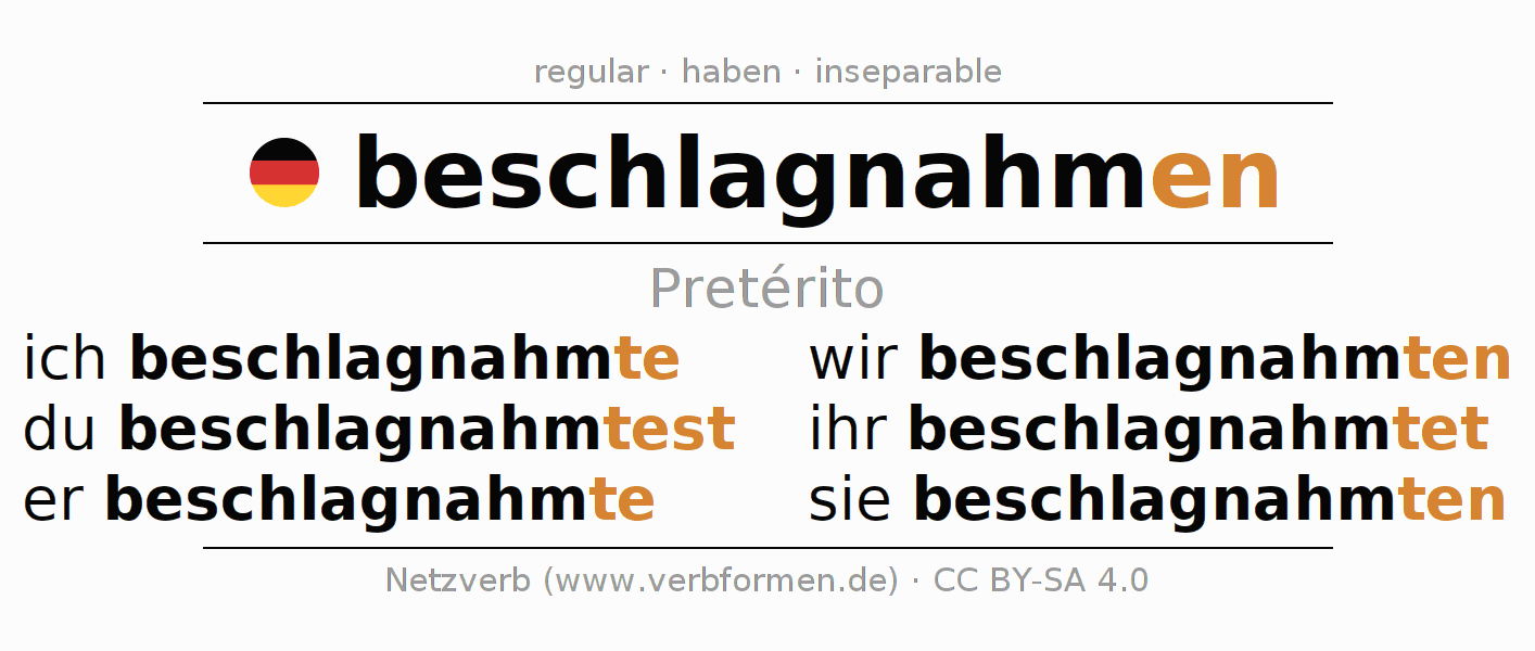 Este verbo beschlagnahmen (confiscar, incautar) se conjuga en pretérito de la siguiente manera: ich beschlagnahmte, du beschlagnahmtest, er beschlagnahmte, wir beschlagnahmten, ihr beschlagnahmtet, sie beschlagnahmten