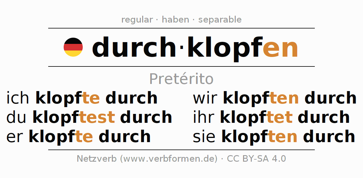 Este verbo durchklopfen (examinar, inspeccionar) se conjuga en pretérito de la siguiente manera: ich klopfte durch, du klopftest durch, er klopfte durch, wir klopften durch, ihr klopftet durch, sie klopften durch