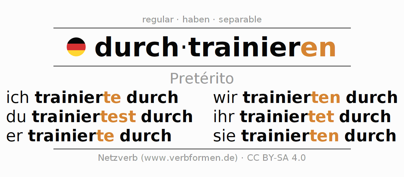 Este verbo durchtrainieren (entrenar bien, someter a entrenamiento) se conjuga en pretérito de la siguiente manera: ich trainierte durch, du trainiertest durch, er trainierte durch, wir trainierten durch, ihr trainiertet durch, sie trainierten durch
