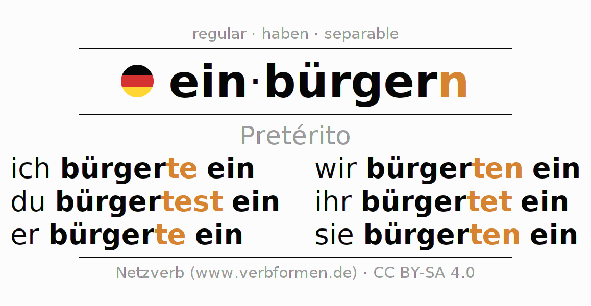 Este verbo einbürgern (naturalizar, naturalizarse) se conjuga en pretérito de la siguiente manera: ich bürgerte ein, du bürgertest ein, er bürgerte ein, wir bürgerten ein, ihr bürgertet ein, sie bürgerten ein