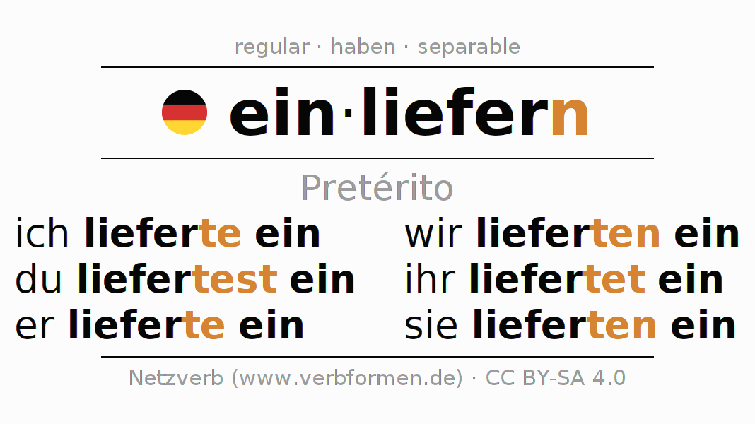 Este verbo einliefern (entregar, ingresar) se conjuga en pretérito de la siguiente manera: ich lieferte ein, du liefertest ein, er lieferte ein, wir lieferten ein, ihr liefertet ein, sie lieferten ein