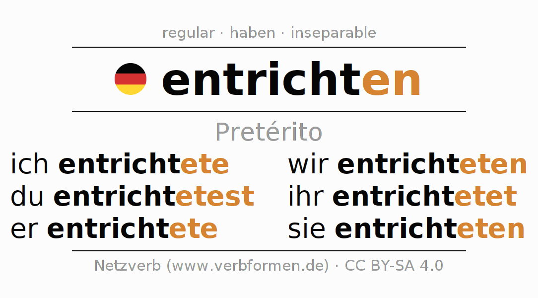 Este verbo entrichten (pagar, abonar) se conjuga en pretérito de la siguiente manera: ich entrichtete, du entrichtetest, er entrichtete, wir entrichteten, ihr entrichtetet, sie entrichteten
