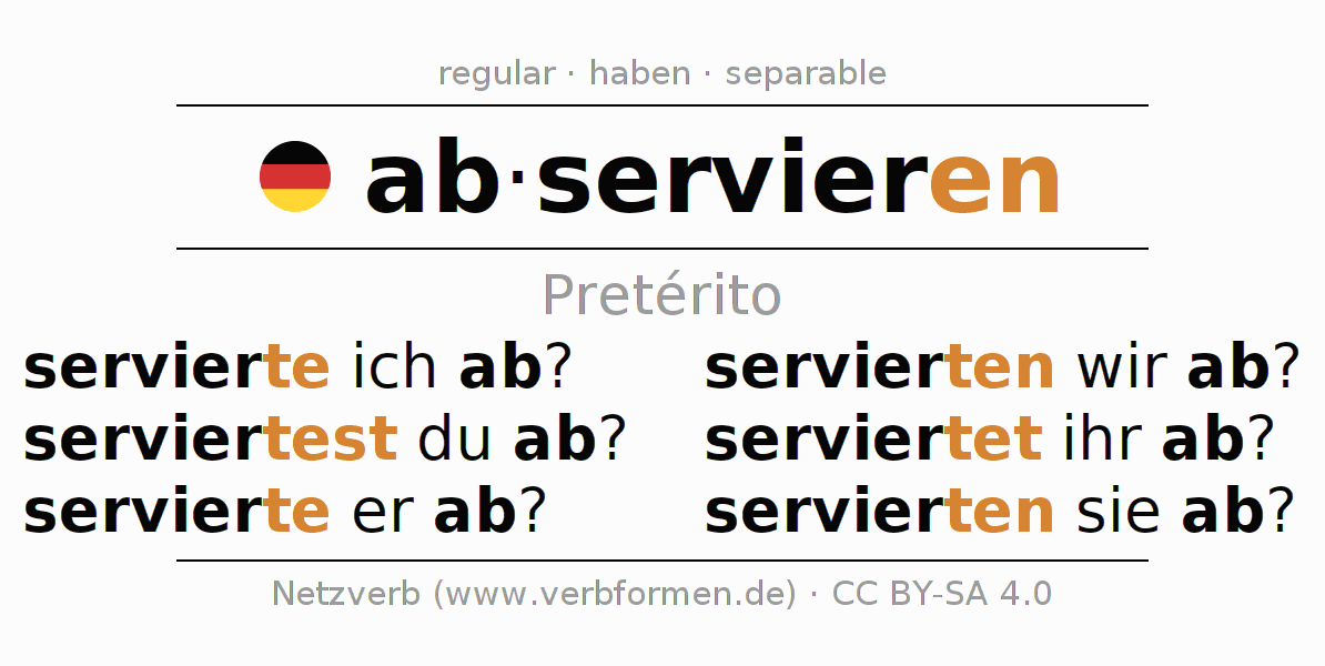 La conjugación de abservieren en Pretérito Indicativo Pasado Activo es servierte ich ab?, serviertest du ab?, servierte er ab?, servierten wir ab?, serviertet ihr ab?, servierten sie ab?.Para construir esta formas se requiere seguir algunas reglas gramaticales y también las especificaciones para la conjugación de verbos simples de abservieren en Pretérito . Comentarios ☆