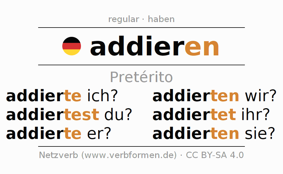La conjugación de addieren en Pretérito Indicativo Pasado Activo es addierte ich?, addiertest du?, addierte er?, addierten wir?, addiertet ihr?, addierten sie?.Para construir esta formas se requiere seguir algunas reglas gramaticales y también las especificaciones para la conjugación de verbos simples de addieren en Pretérito . Comentarios ☆