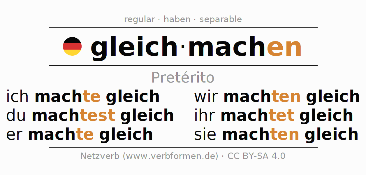 Este verbo gleichmachen (igualar, nivelar) se conjuga en pretérito de la siguiente manera: ich machte gleich, du machtest gleich, er machte gleich, wir machten gleich, ihr machtet gleich, sie machten gleich