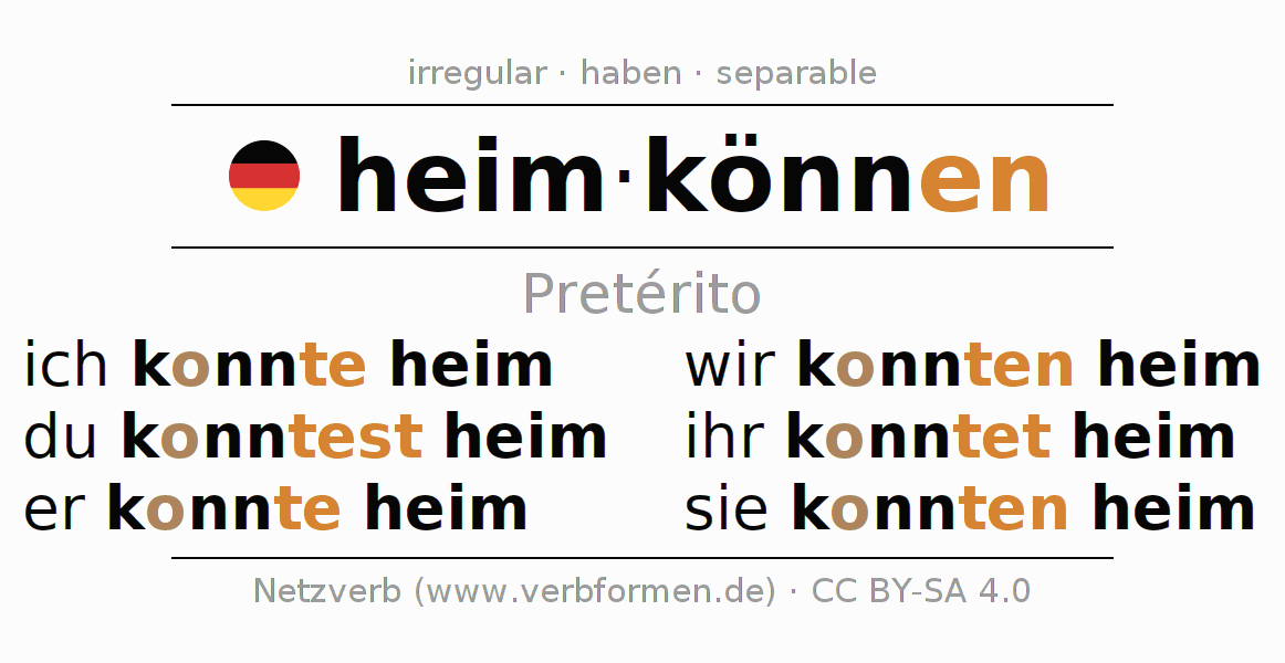 Este verbo heimkönnen (regresar, volver a casa) se conjuga en pretérito de la siguiente manera: ich konnte heim, du konntest heim, er konnte heim, wir konnten heim, ihr konntet heim, sie konnten heim