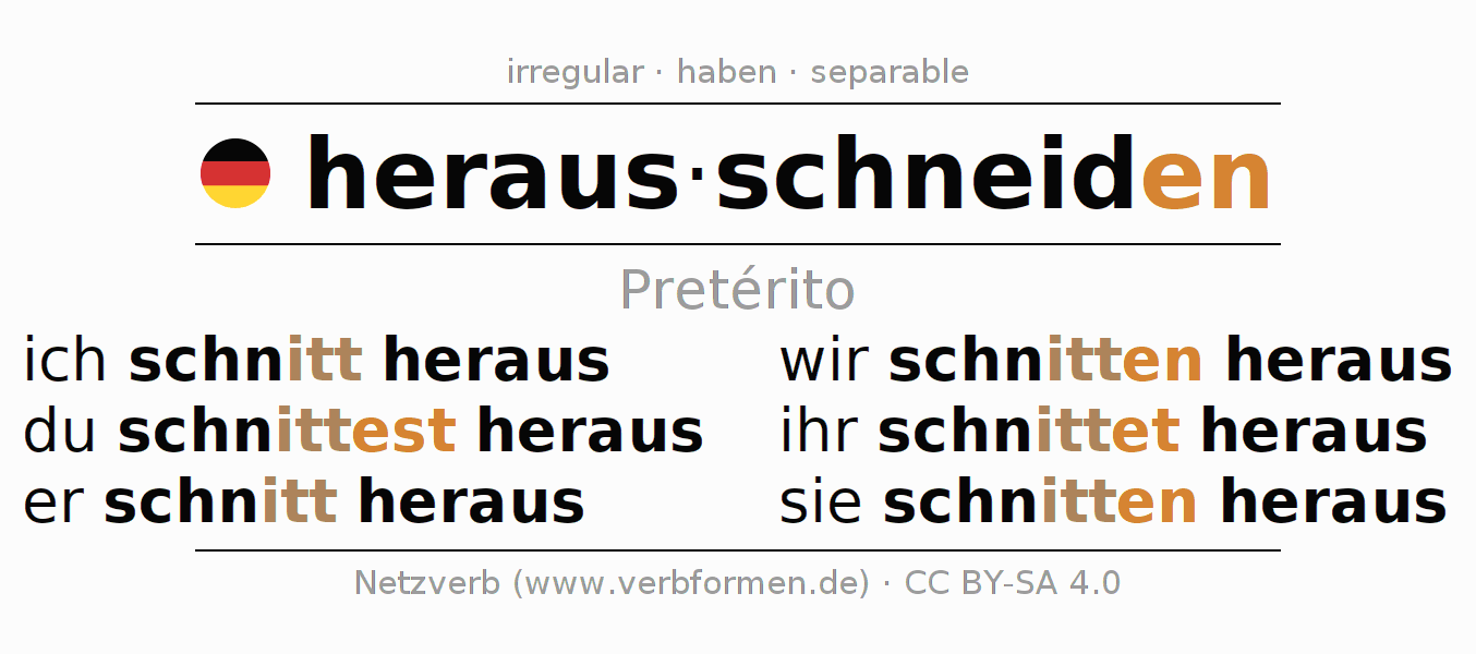 Este verbo herausschneiden (extirpar, recortar) se conjuga en pretérito de la siguiente manera: ich schnitt heraus, du schnitt(e)st heraus, er schnitt heraus, wir schnitten heraus, ihr schnittet heraus, sie schnitten heraus