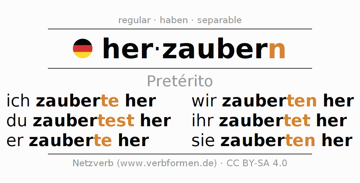 Este verbo herzaubern (conjurar, invocar) se conjuga en pretérito de la siguiente manera: ich zauberte her, du zaubertest her, er zauberte her, wir zauberten her, ihr zaubertet her, sie zauberten her