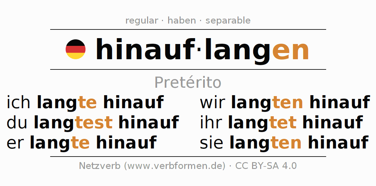 Este verbo hinauflangen (agarrar, alcanzar) se conjuga en pretérito de la siguiente manera: ich langte hinauf, du langtest hinauf, er langte hinauf, wir langten hinauf, ihr langtet hinauf, sie langten hinauf
