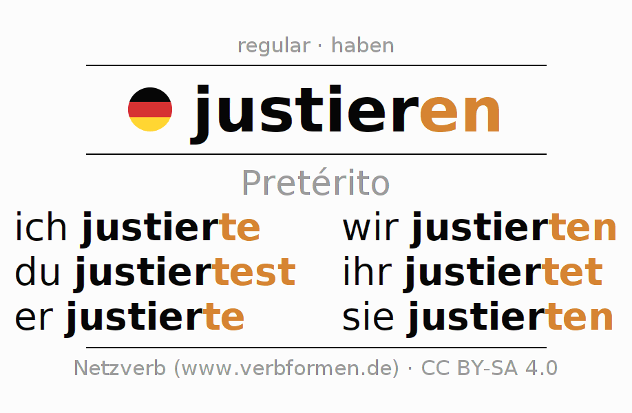 El verbo justieren, conjugado completamente en todas las personas y números gramaticales en Pretérito Indicativo.