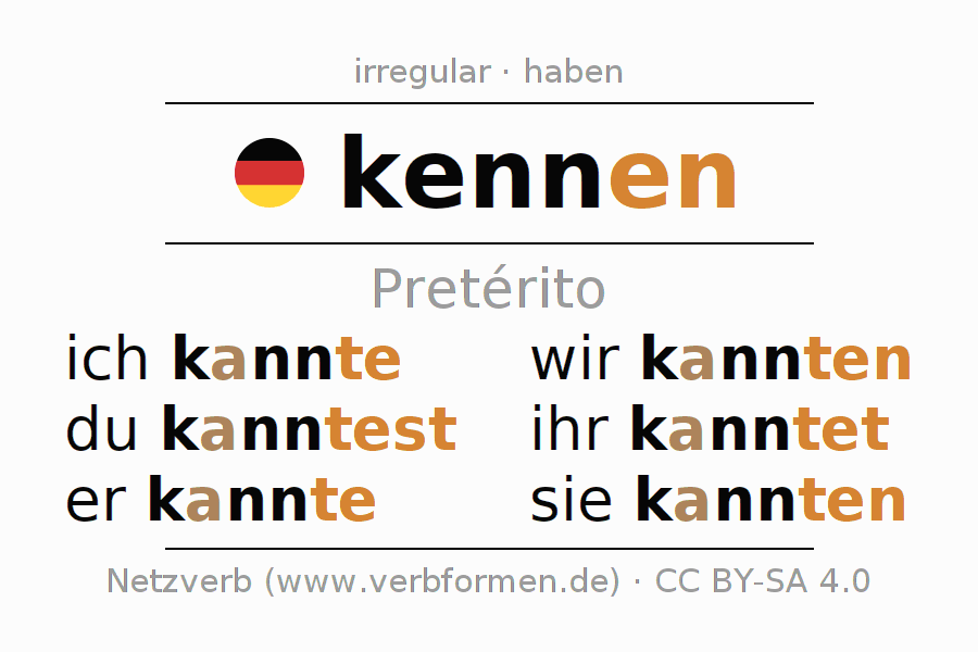 Este verbo kennen (conocer, saber) se conjuga en pretérito de la siguiente manera: ich kannte, du kanntest, er kannte, wir kannten, ihr kanntet, sie kannten
