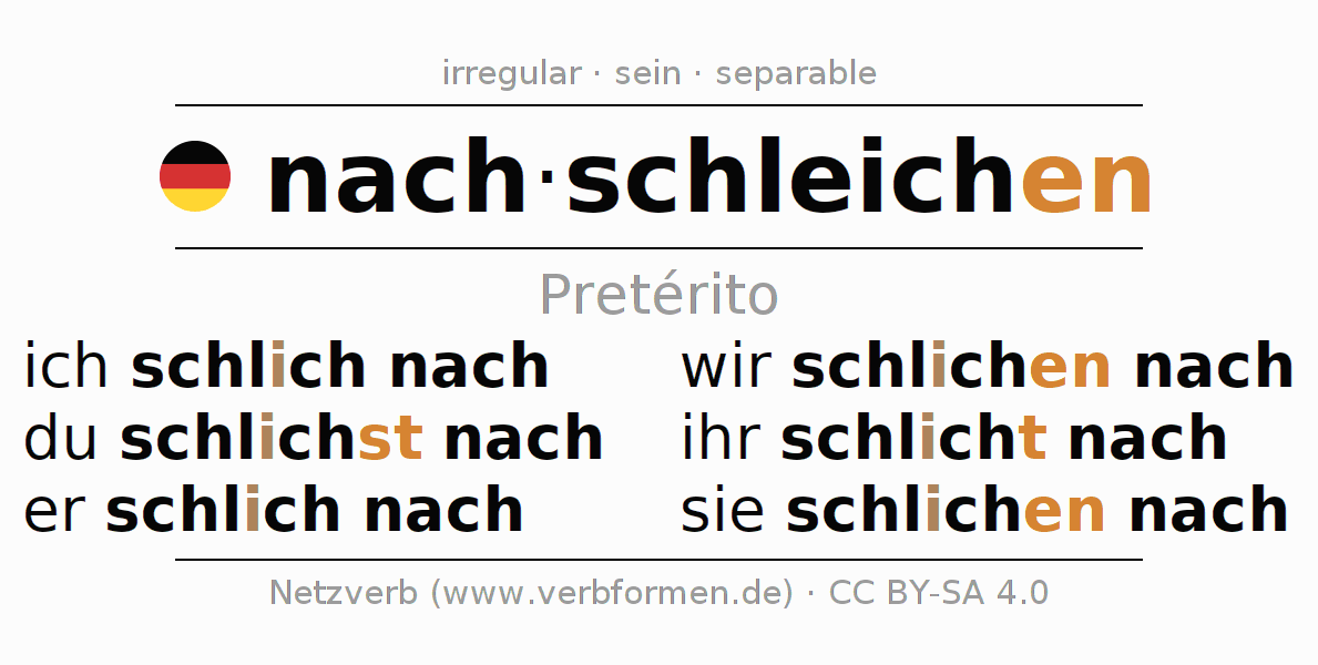 Este verbo nachschleichen (perseguir, seguir) se conjuga en pretérito de la siguiente manera: ich schlich nach, du schlichst nach, er schlich nach, wir schlichen nach, ihr schlicht nach, sie schlichen nach