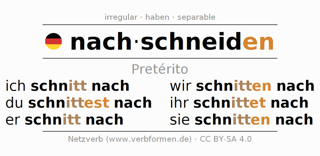 Este verbo nachschneiden (ajustar, atusar) se conjuga en pretérito de la siguiente manera: ich schnitt nach, du schnitt(e)st nach, er schnitt nach, wir schnitten nach, ihr schnittet nach, sie schnitten nach