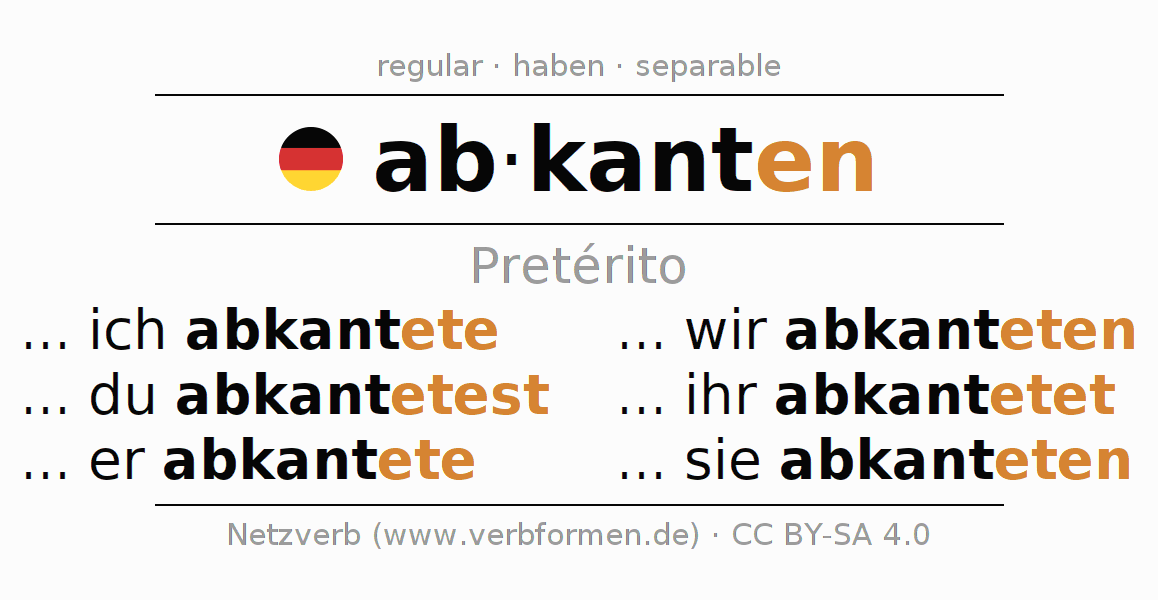 El verbo abkanten, conjugado completamente en todas las personas y números gramaticales en Pretérito Indicativo.