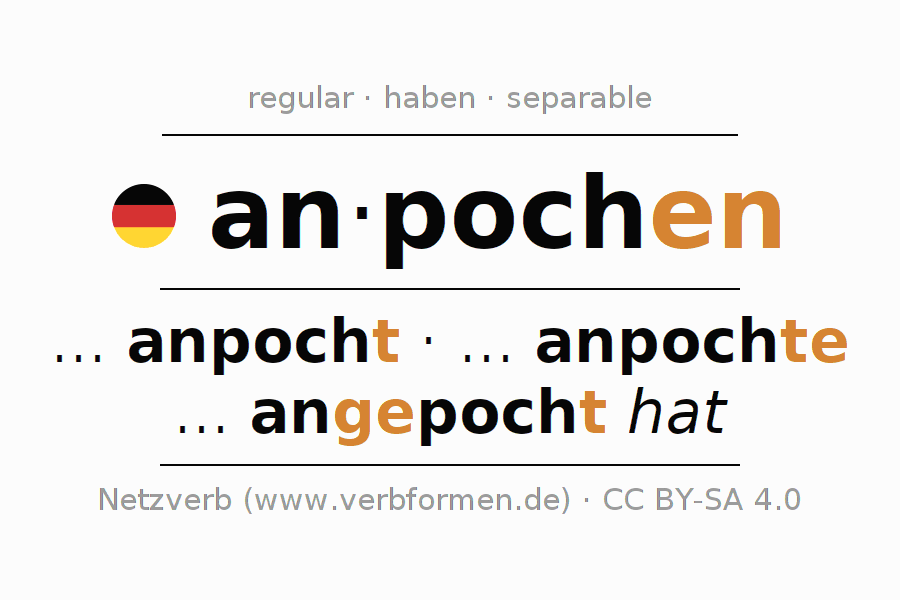 La conjugación de anpochen en Pretérito Indicativo Pasado Activo es ... ich anpochte, ... du anpochtest, ... er anpochte, ... wir anpochten, ... ihr anpochtet, ... sie anpochten.Para construir esta formas se requiere seguir algunas reglas gramaticales y también las especificaciones para la conjugación de verbos simples de anpochen en Pretérito . Comentarios ☆