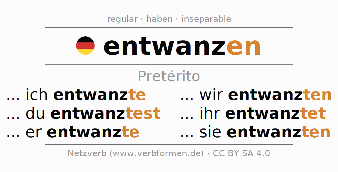 El verbo entwanzen, conjugado completamente en todas las personas y números gramaticales en Pretérito Indicativo.