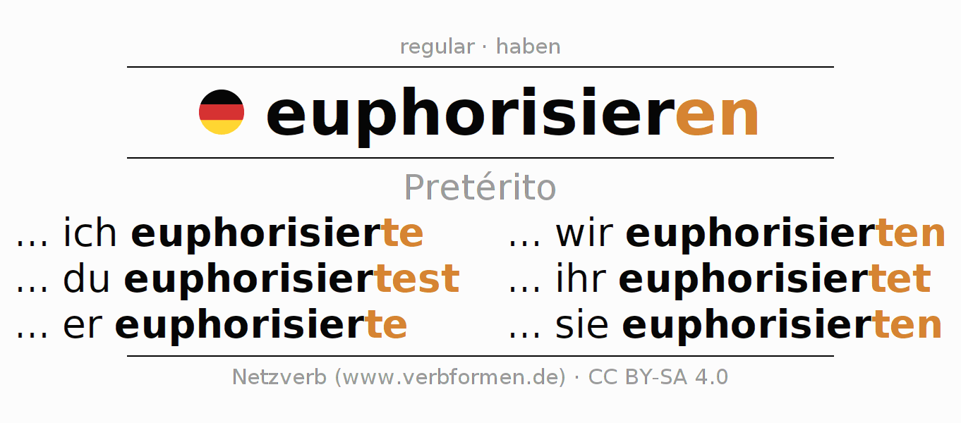 El verbo euphorisieren, conjugado completamente en todas las personas y números gramaticales en Pretérito Indicativo.