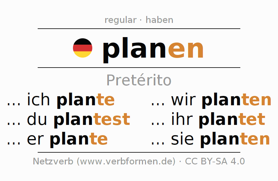 La conjugación de planen en Pretérito Indicativo Pasado Activo es ... ich plante, ... du plantest, ... er plante, ... wir planten, ... ihr plantet, ... sie planten.Para construir esta formas se requiere seguir algunas reglas gramaticales y también las especificaciones para la conjugación de verbos simples de planen en Pretérito . Comentarios ☆