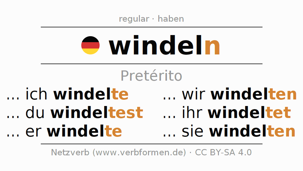 El verbo windeln, conjugado completamente en todas las personas y números gramaticales en Pretérito Indicativo.