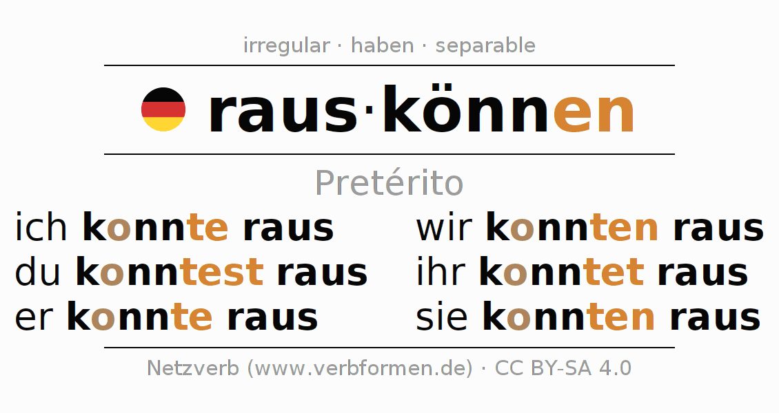 Este verbo rauskönnen (poder salir, escapar) se conjuga en pretérito de la siguiente manera: ich konnte raus, du konntest raus, er konnte raus, wir konnten raus, ihr konntet raus, sie konnten raus