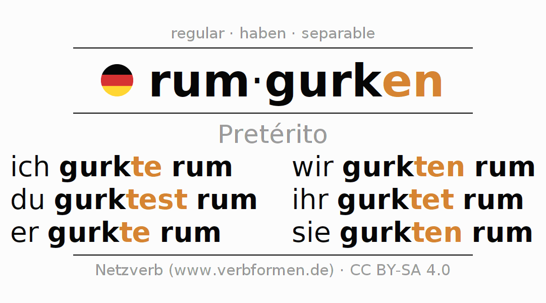 Este verbo rumgurken (deambular, vagar) se conjuga en pretérito de la siguiente manera: ich gurkte rum, du gurktest rum, er gurkte rum, wir gurkten rum, ihr gurktet rum, sie gurkten rum
