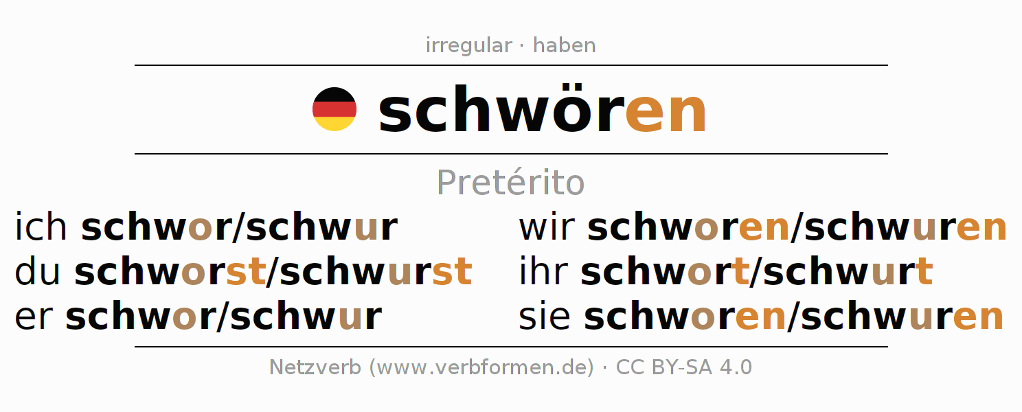 Este verbo schwören (jurar, prometer) se conjuga en pretérito de la siguiente manera: ich schwor/schwur, du schworst/schwurst, er schwor/schwur, wir schworen/schwuren, ihr schwort/schwurt, sie schworen/schwuren